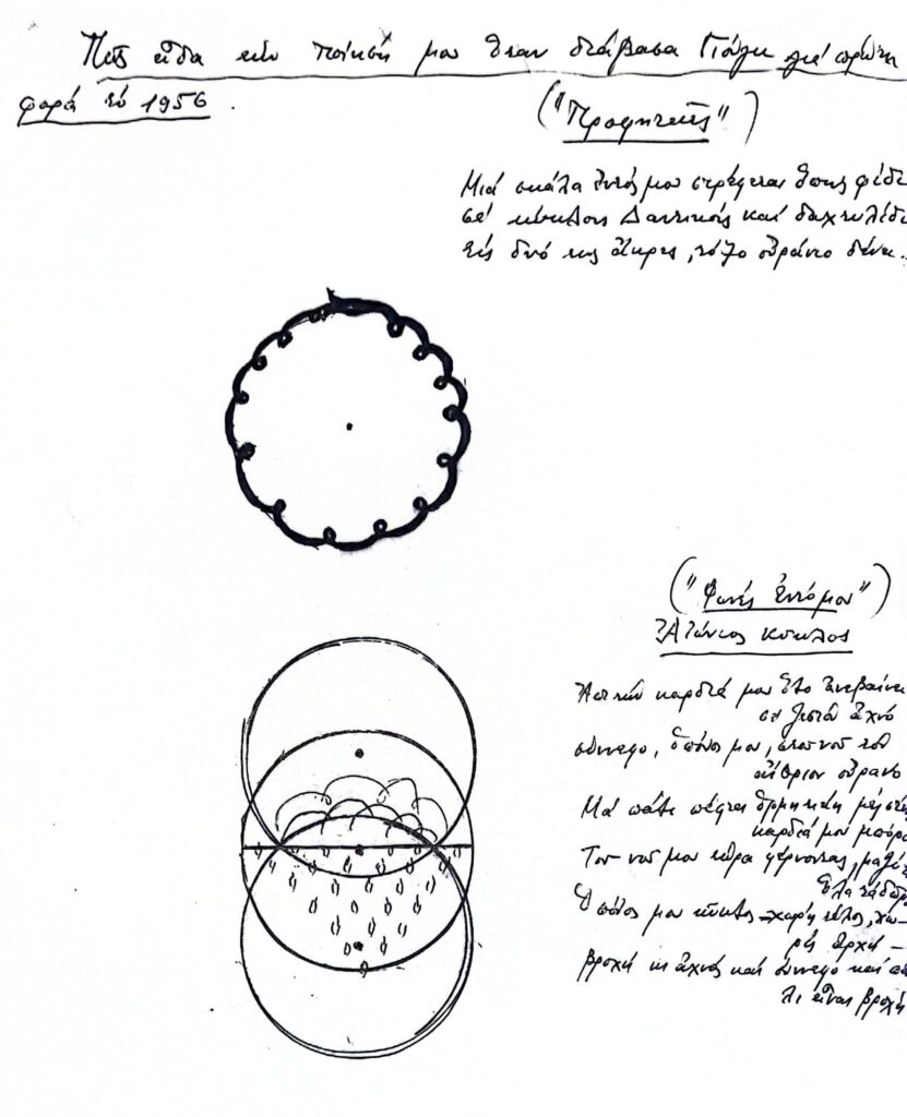 Το δεύτερο σκίτσο, συμπτωματικά, αποτελεί εικαστική ερμηνεία του κύκλου του νερού — βασικό θέμα του ποιήματος «Αιώνιος κύκλος» από την πρώτη της συλλογή Φωνές εντόμων (1930):